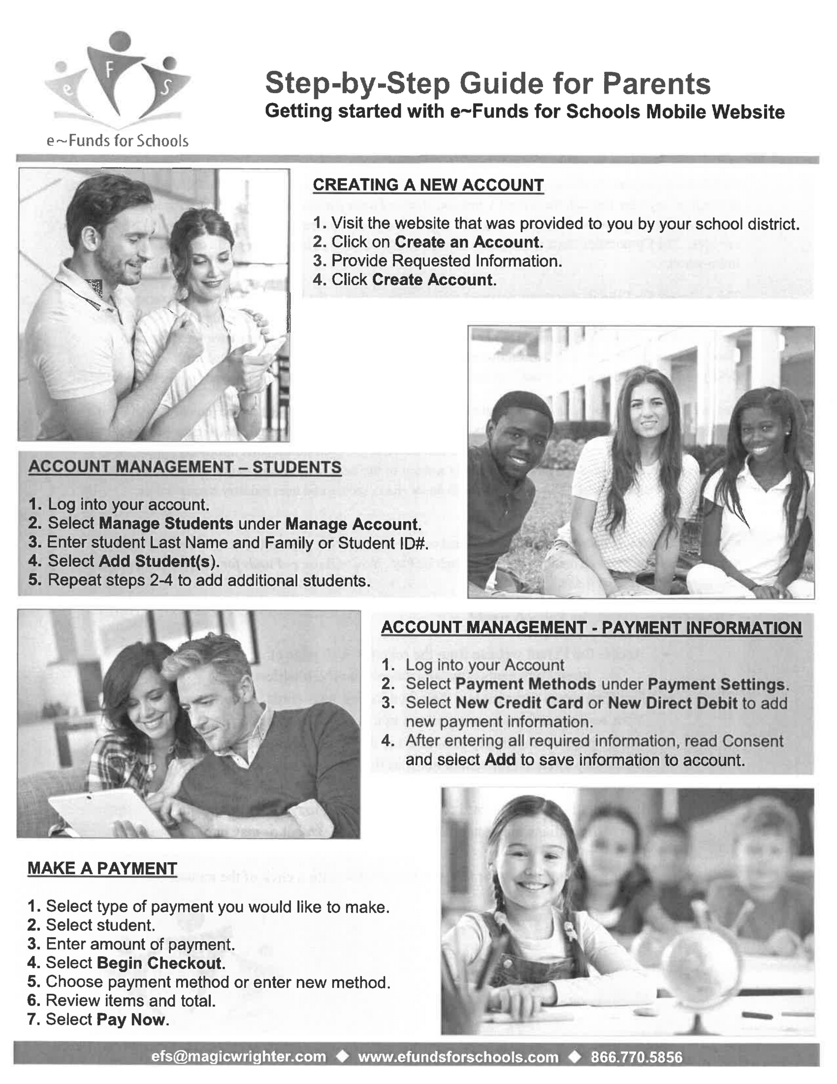 The e~Funds for Schools electronic payment service is provided to the school by a third party service provider. The service provider has a nominal fee for their service. For payments made by credit or debit card, there is a $3.00 convenience fee per transaction. There is a $1.00 convenience fee for each electronic checking payment transaction that you make. The system carries a Non-Sufficient Funds (NSF) charge if the payment is “bad.” When you set up your account, please review your options carefully.
